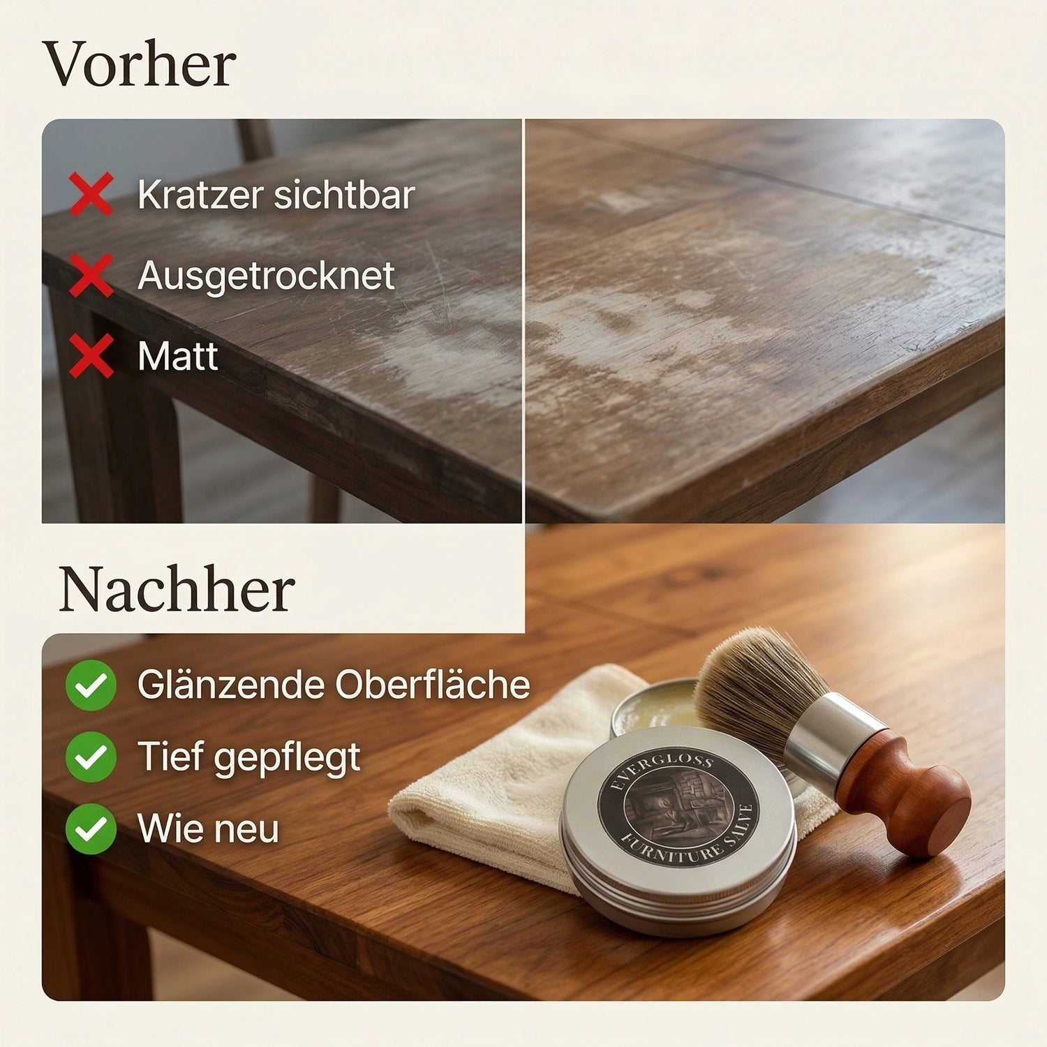 Auf jeden Fall! EverGloss™ ist sanft genug für antike Möbel und hilft dabei, sie zu pflegen, zu schützen und schonend zu erneuern – ganz ohne Schäden.