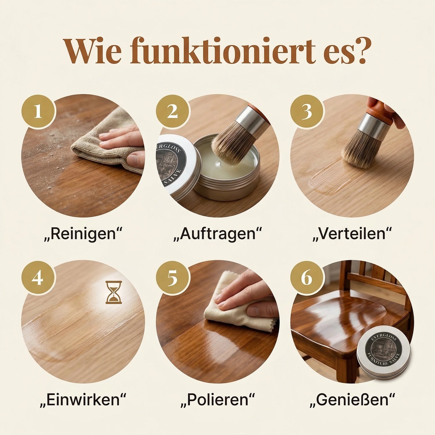 Die schutzende Schicht von EverGloss™ hält mehrere Monate, abhängig von Nutzung und Abnutzung. Regelmäßige Anwendung sorgt dafür, dass deine Möbel und Lederwaren in Top-Zustand bleiben.